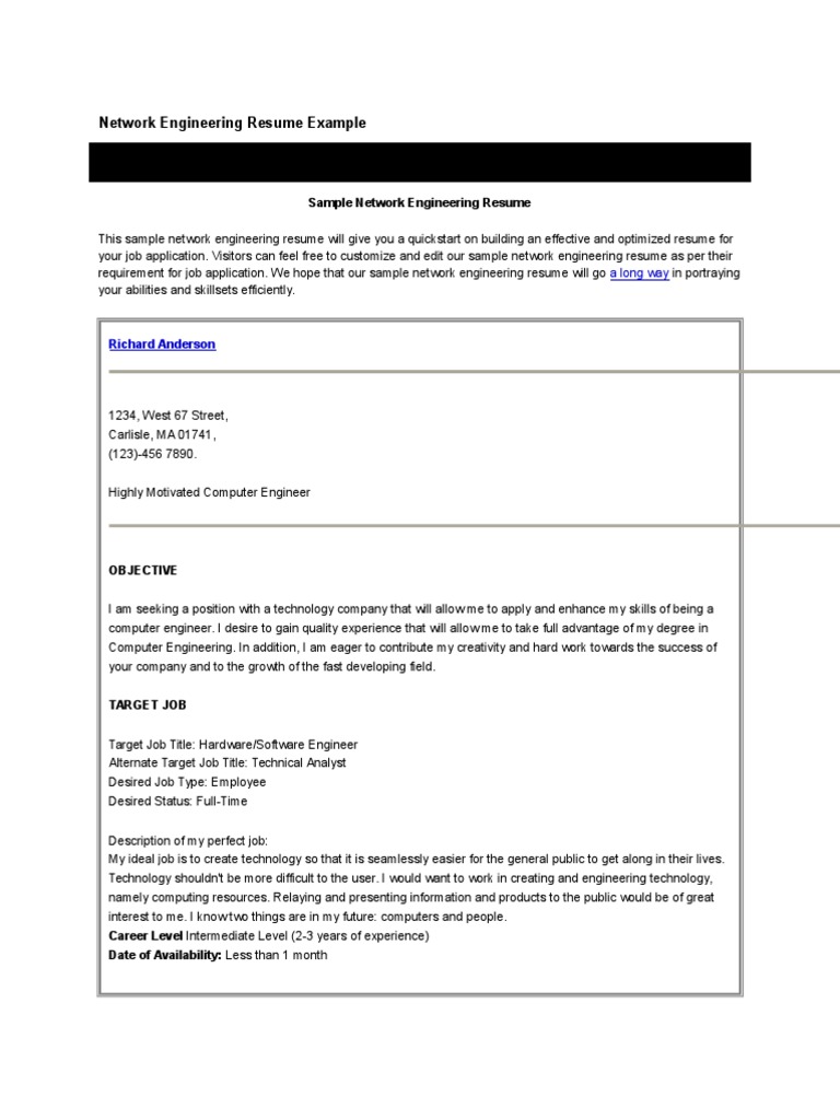 Network Engineer Resume Example Free Resume Templates . Samples represent that of an actual working technical professional found on the web and modified to protect the privacy of these professionals.