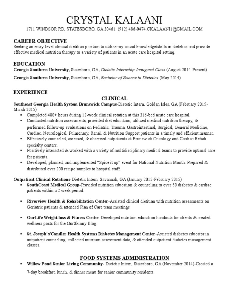 Resume Crystal Vasquez Ms Rdn Registered Dietitian Nutritionist. Browse registered dietitian resume samples and read our guide on how to write a registered dietitian resume. Registered dietitian role is responsible for interpersonal, computer, nutrition, clinical, health, travel, research, medical to write great resume for registered dietitian job, your resume must include Since resume provides you with a golden chance of getting an interview call, make sure you invest ample effort in making one. Resume writing for registered dietitian position is an art. This resume was created for a client that had served as a clinical registered dietitian, nutritionist and research assistant. Download sample resume templates in pdf, word formats. Registered dietitians work for healthcare facilities or wellness centers and complete the following tasks: Registered dietitian resume samples with headline, objective statement, description and skills examples. Registered dietitian resume examples & samples. Registered dietitians are required to get specialized training in order to enter the field. Learn about the education needed to become a registered dietitian, as well as the earning potential and job. Savesave registered dietitian resume for later. 0 ratings0% found this document useful (0 votes). Resume advice for consultant dietitians. The job seeker didn't feel their employment history was utilizing their knowledge.